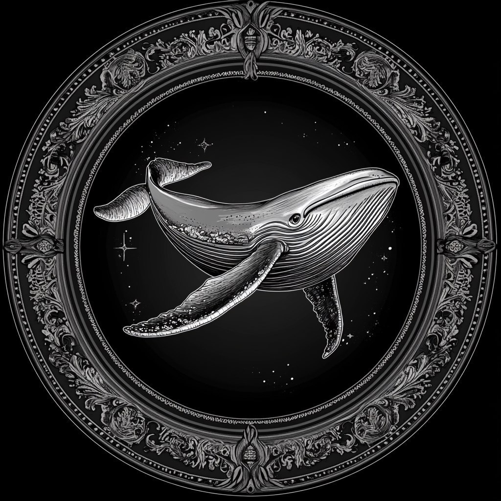 Создано на основе запроса: create a coin in illustration, in flat drawing style, with an illustrated whale in the center , on a black