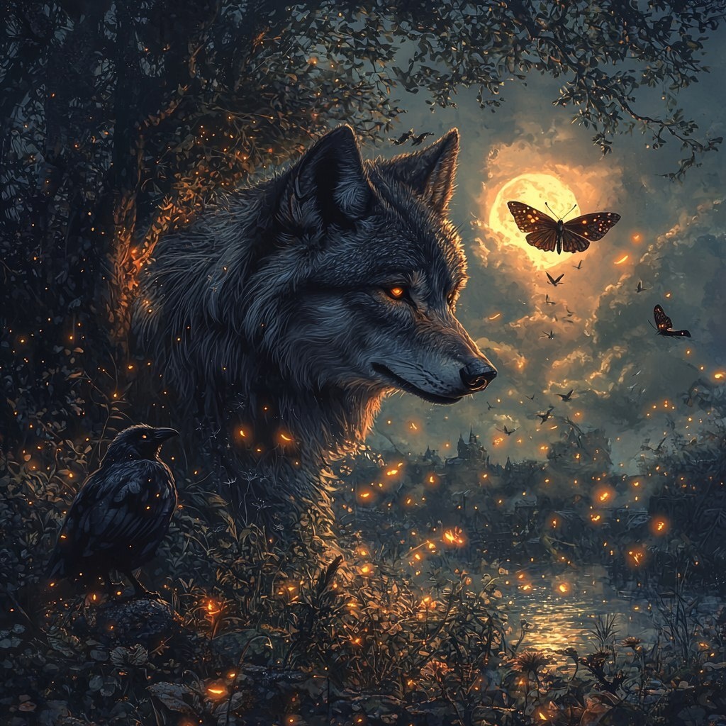 Создано на основе запроса: wolf, bat, moth, raven and fireflies on a medieval beautiful and dark landscape, nature and epic looking fantasy