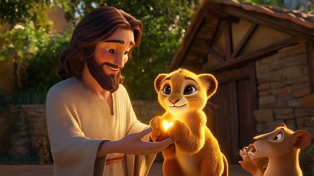 Создано на основе запроса: 3d cartoon animation Jesus places His hand on the lion cub's chest. The cub’s heart glows with a golden light, and he feels a rush of warmth and joy. His animal friends cheer as they see the love filling his heart.