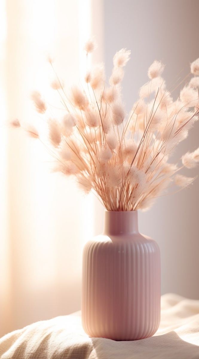 Создано на основе запроса: Dried flowers in pastel pink and beige colors are placed on the table of an aesthetic room with soft lighting