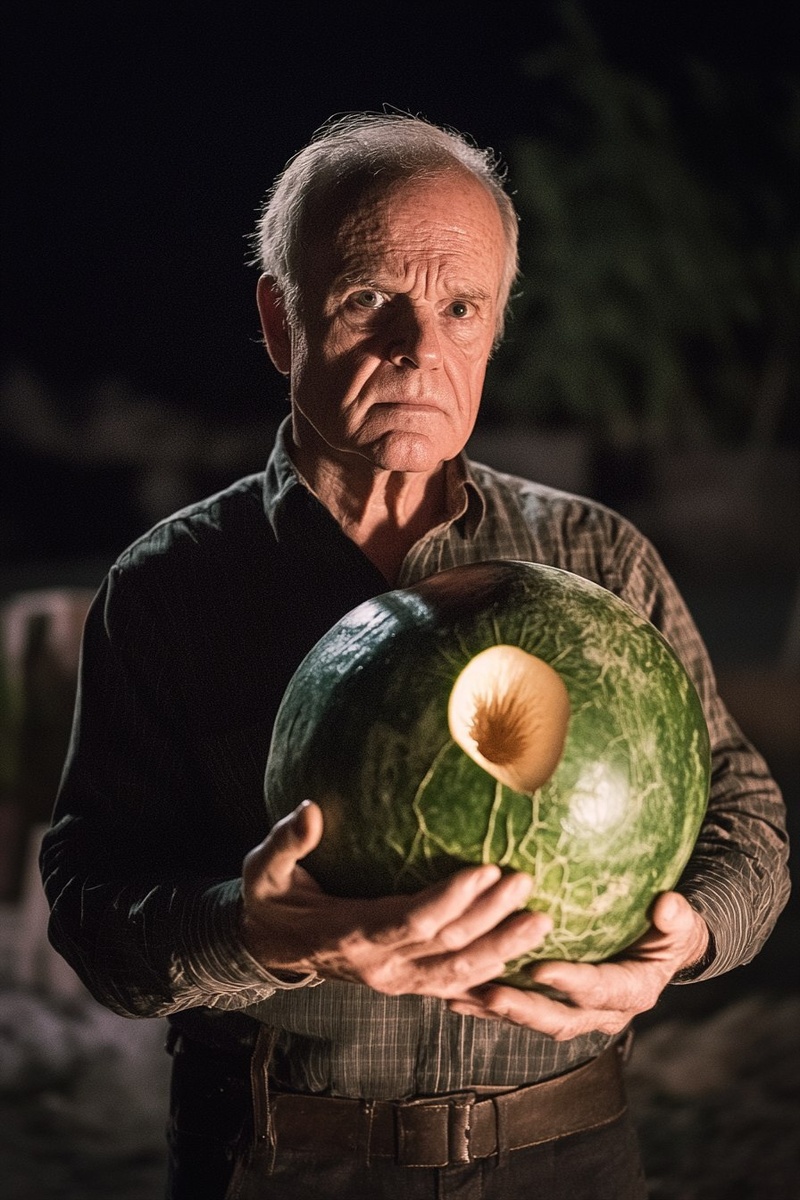 Создано на основе запроса: a photograph of Cormac McCarthy carrying a watermellon with a hole in its side