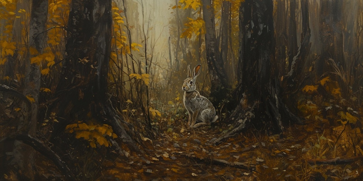 Создано на основе запроса: Many small, quick-footed hares are abundant in the forest’s meadows and clearings. They have brown, speckled coats that blend well with the underbrush, making them difficult to spot. Deep forest, glade, one hare with patches of grey fur. Dark fantasy, oil like. Atleast 10 hares