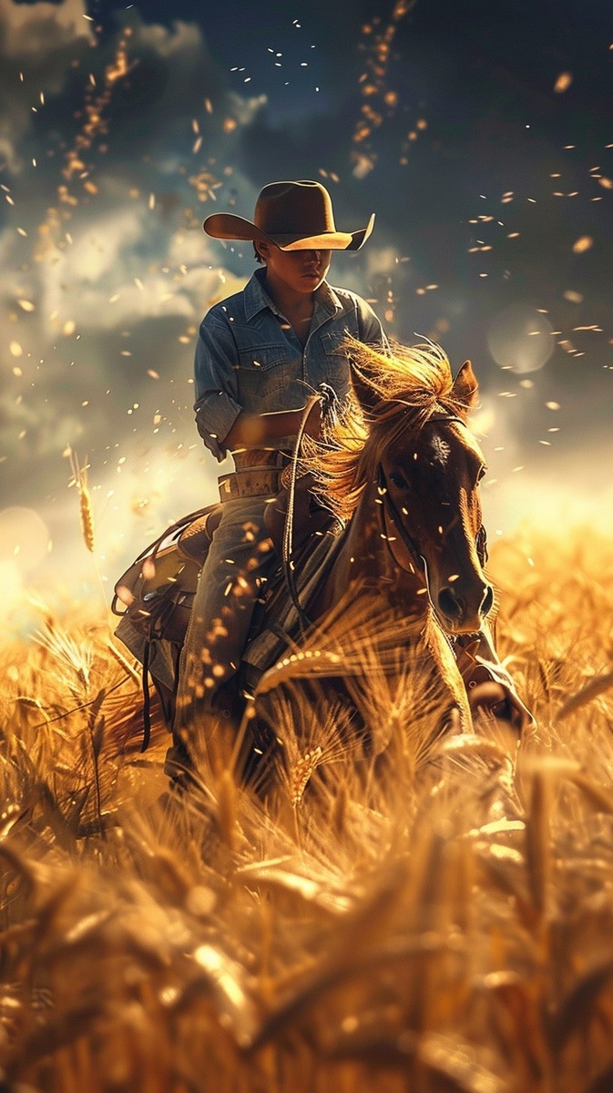 Создано на основе запроса: a young cowboy riding through a golden wheat field, the wind in his hair