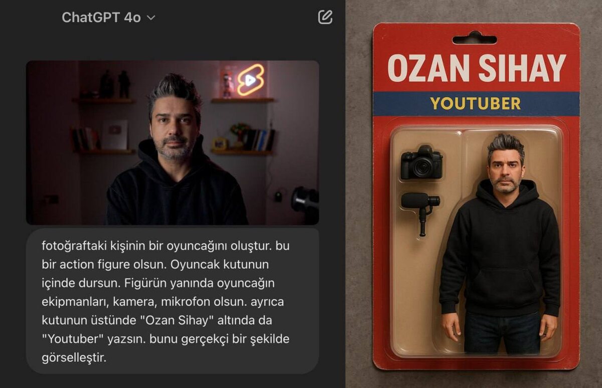 ChatGPT теперь создает фигурки по вашим фотографиям! 🎉🤖 Теперь вы можете создать свою уникальную экшен-фигурку с помощью ChatGPT. Для этого выполните следующие шаги: 1. Загрузите свою фотографию в новый чат. 2. Введите промт, указав свои данные: "Создай игрушку человека на фото". Уточните, что это должна быть экшен-фигурка, стоящая в коробке, рядом с которой должны находиться аксессуары: [камера] и [микрофон]. Также на верхней части коробки должно быть написано [ваше имя], а чуть ниже — [ваша роль]. Постарайтесь сделать изображение максимально реалистичным. Попробуйте сейчас! 🧠 AI Grid