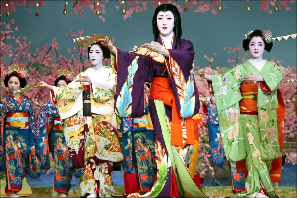 В соответствии с темой выступления меняются и наряды танцовщиц. Но это всегда очень красивые и проработанные кимоно, а дополняют образ изысканные прически и традиционный белый грим. В финале выступления все его участницы одновременно выходят на сцену: удивительное и захватывающее зрелище.