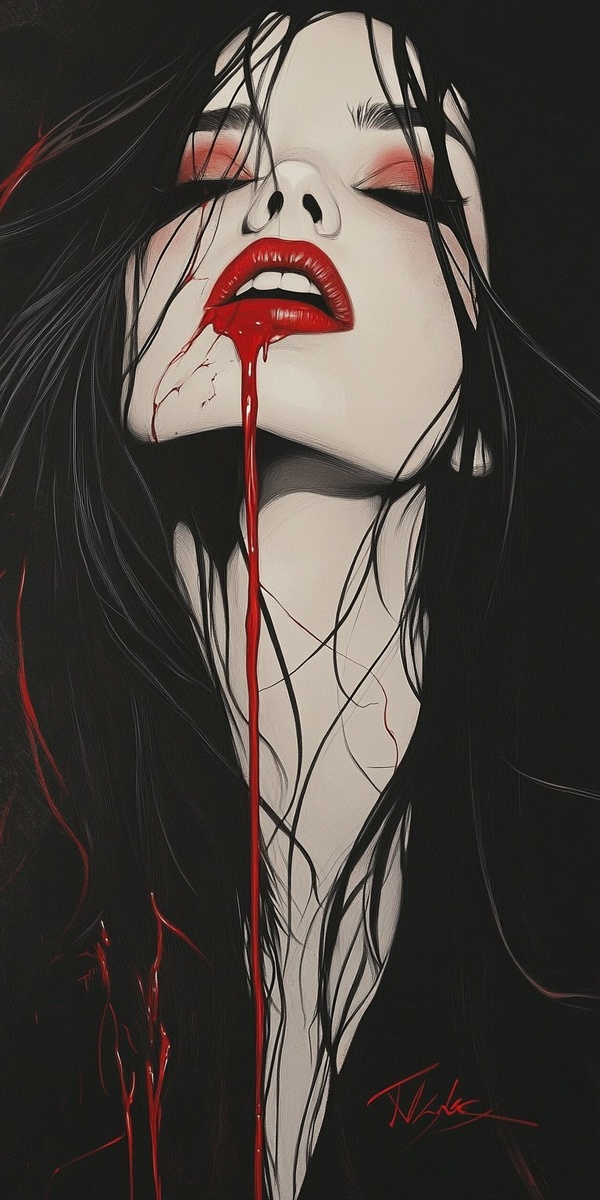 Создано на основе запроса: : Dramatic Dark Portrait Sinful GOTH Acid Vampire woman with long hair, red lips and a red liquid dripping from
