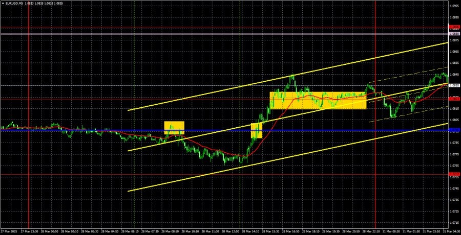 Валютная пара EUR/USD в течение пятницы вновь торговался с повышением, хотя особых причин для этого не было. Напомним, что в четверг стало известно о новых пошлинах Дональда Трампа, после чего укрепление доллара, которое длилось пару недель, быстро закончилось. В пятницу макроэкономический фон уже не играл никакого значения для рынка, а на горизонте – 2 апреля, когда президент США может ввести новые пошлины. В пятницу из макроэкономических событий можно отметить уровень безработицы в Германии(вырос с 6,2% до 6,3%), заявки на пособия по безработице в Германии(+26 тысяч против прогноза +10 тысяч), индекс PCE в США(+0,4% при прогнозе +0,3%) и индекс настроения потребителей от университета Мичиган(падение с 64,7 пунктов до 57,0). Как видим, европейские отчеты не поддерживали евро, а американские оказались противоречивыми и противоположными по характеру. Индекс PCE – это один и инфляционных индексов. Если он растет, то это хорошо для…