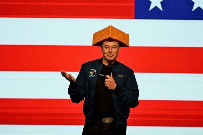 Илон Маск, бизнесмен и глава департамента государственного управления США, посетил встречу членов Американского политического общества (America PAC) в необычной шляпе, форма которой была оформлена как кусок сыра.
