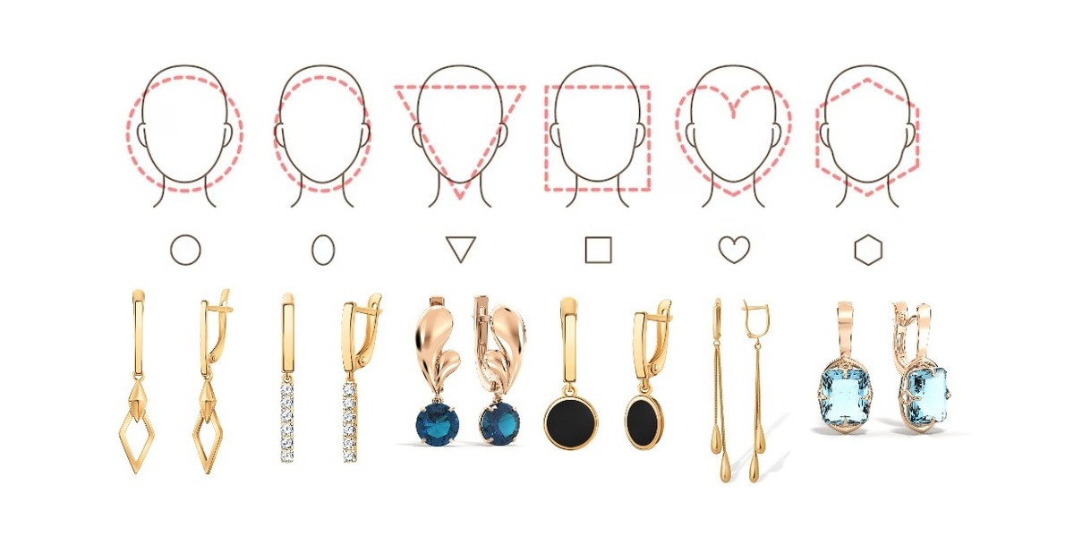 Рекомендуемые варианты: длинные серьги, висячие модели, прямоугольные или треугольные формы.