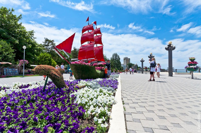 Одно из самых узнаваемых украшений набережной — скульптура «Алые паруса». Её установили местные предприниматели, вдохновившись одноимённой книгой. Корабль высотой более семи метров стал точкой притяжения для фото.
