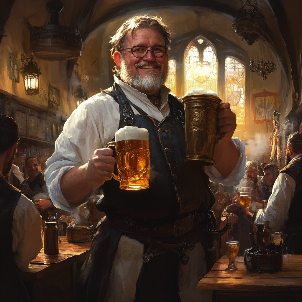 Создано на основе запроса: male inn keeper with a clean apron, he is a powerful man holding a beer stein, style Greg rutkowski, setting crowded inn’s pub in a dnd world