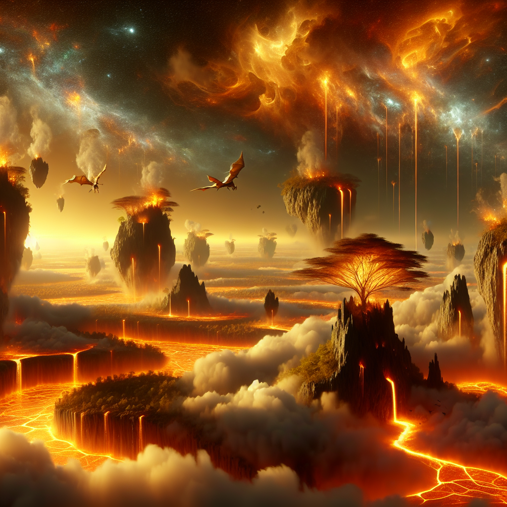В этом фантастическом крае облака не в небе, а под ногами — густая, тёплая золотистая пелена, через которую видны проблески лавовых ручьёв и светящихся трещин. Из этой облачной земли поднимаются острова-скалы — настоящие плавучие обители, покрытые странной живой лавой. На их вершинах растут деревья с пылающими кронами, каждая веточка которых искрит звёздной энергией. По небу текут огненные реки — сияющие ленты, бегущие к горящему горизонту. Здесь обитают существа из пепельных теней со светящимися глазами, способные управлять раскалёнными потоками, словно дирижируя огненной симфонией.