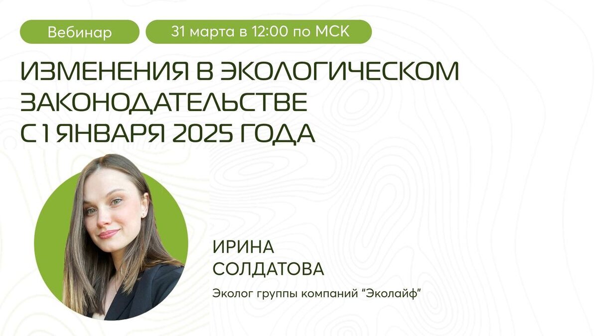 Уже сегодня! 31 марта в 12:00 (МСК) ждем вас на вебинаре «Изменения в экологическом законодательстве в 2025 году»! Вход в вебинарную