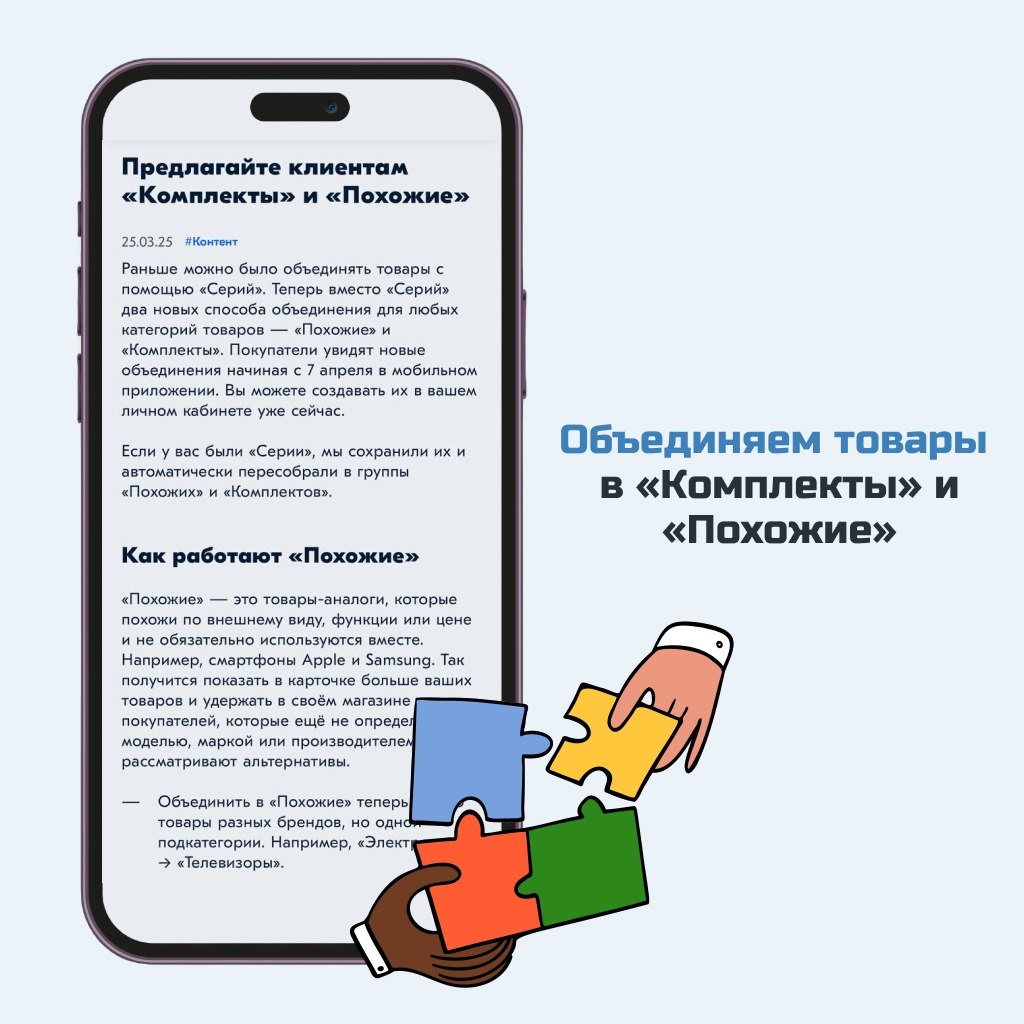 «Комплекты» и «Похожие»🪞 Раньше объединяли товары в «Серии». Сейчас появятся «Похожие» и «Комплекты». Покупатели увидят новые объединения с 7 апреля в мобильном приложении. Если уже делали «Серии», маркетплейс автоматически пересобрал их в группы «Похожих» и «Комплектов». «Похожие» — это товары-аналоги. Сюда можно объединить товары, похожие внешне, функции или цене. Если покупатель еще не определился с моделью, в карточке он увидит больше ваших товаров. Объединение в «Комплекты» позволяет показать в карточке сопутствующие товары отдельным блоком. Если покупатели ищут полный комплект товаров, то смогут добавить предложенные товары в корзину, а не искать их дальше. Интересно посмотреть, как изменятся продажи после нововведения. Обновление должно помочь нам в продвижении других товаров магазина 🤞