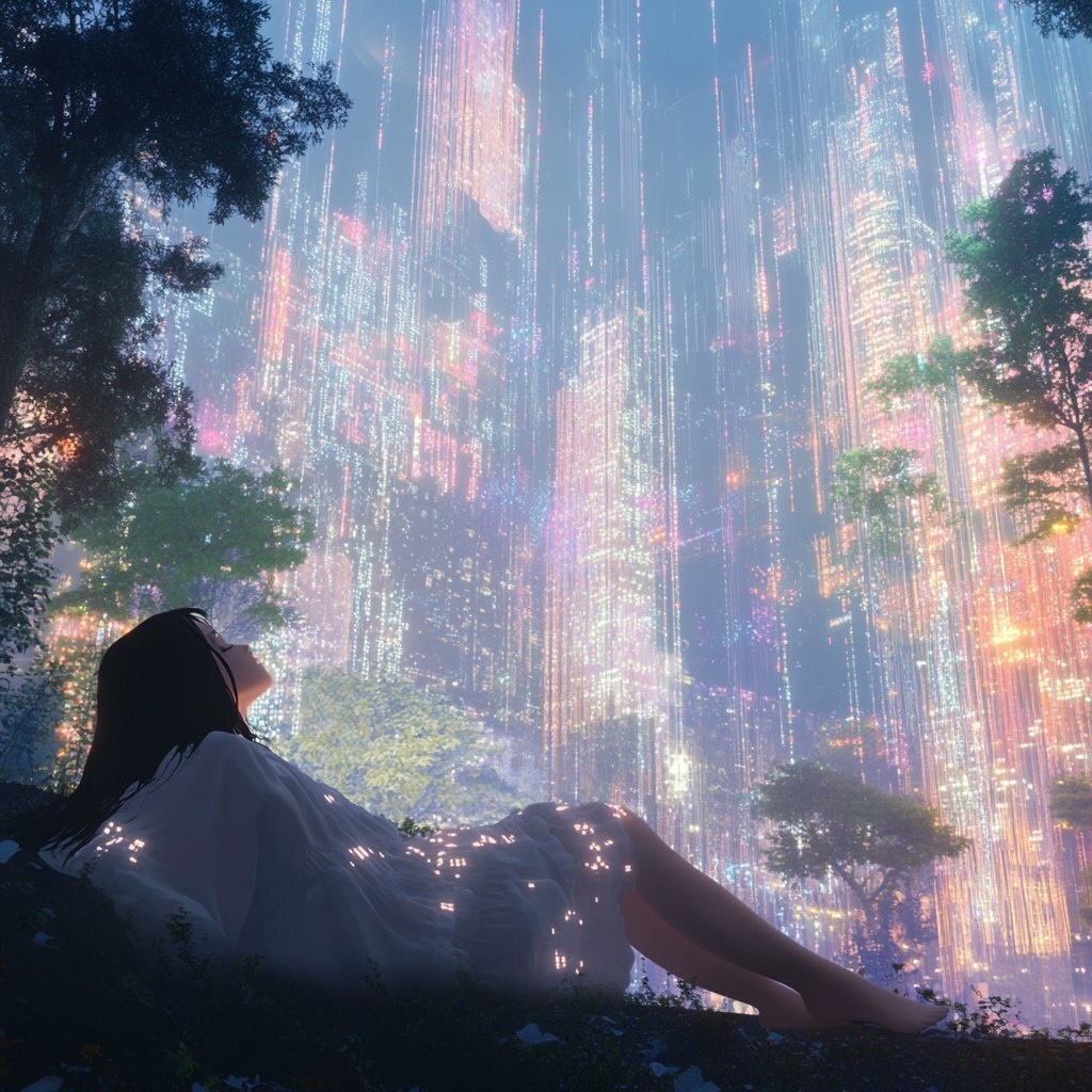 Создано на основе запроса: a beautiful girl day dreaming of a pixel forest, ultra cinematic
