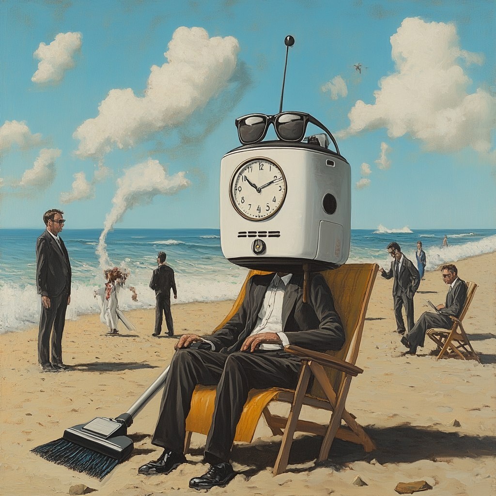 Создано на основе запроса: in a severance style office setting, not beach. vacuum with sunglasses on their head, clockface, toaster chilling on a lounge chair on the beach while people in suits are in the background sweeping, washing dishes, and doing office work miserably. --- Автоперевод: В офисной обстановке в стиле выходного дня, а не на пляже. Как тебе генерация? 🤔 https://dzen.ru/id/65c0c65c86e4f837c27b24d7 #ИИ #AI #нейросеть #midjourney #art