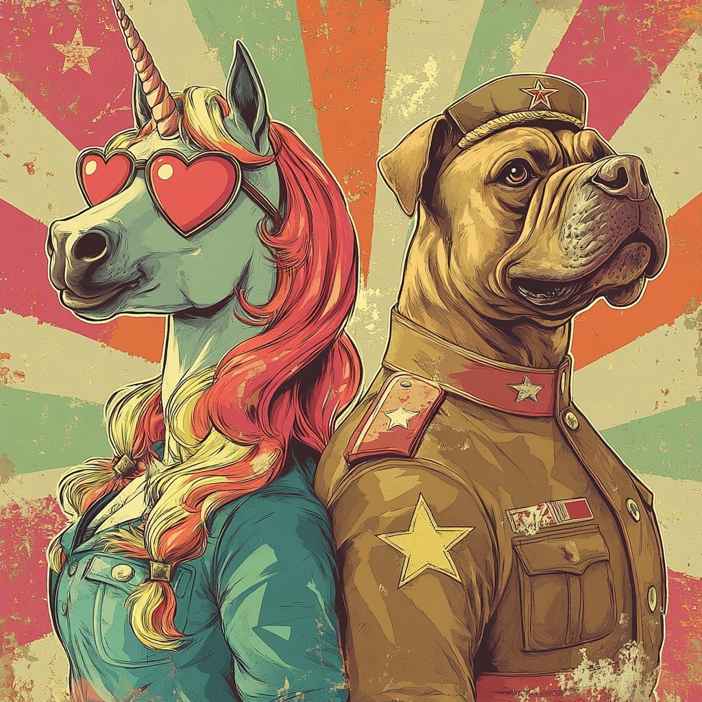 Создано на основе запроса: Soviet era brutalist propaganda poster featuring two characters standing back to back, a gorgeous unicorn horse queen witch wearing heart shaped spectacles and smiling a photogenic smile, the unicorn horse queen witch has a strawberry blonde mane, the unicorn horse witch queen stands back to back with a purebred brown boxer dog with floppy ears wearing a Mao style uniform and has a Stalin like mustache, there is no text or writing on the poster, just the two characters --- Автоперевод: Советская эра груталистская пропагандистская плаката с двумя персонажами, стоящими спиной к спине, великолепной королеве -королеве единорогов, одетая в души в форме сердца и улыбаясь фотогеничной улыбкой, у коричневой королевы единорогов есть грива клубничного блондинка, у коричневой коллеги -корях, не старая, не станет некол, не станет для стали, не старая, не старая, не станет неколевой, а не в стиле. Как тебе вариант? 🤔 https://dzen.ru/id/65c0c65c86e4f837c27b24d7 #ИИ #AI