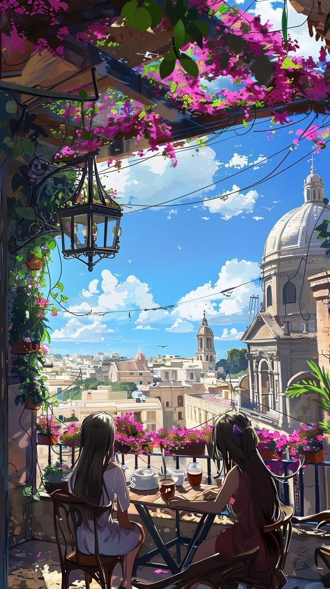 Создано на основе запроса: Anime of the rooftop garden at Sli Tracy inValletta, with some blooming bougainvilleas and people sitting around drinking coffee or eating lunch,two asian girls with long hair is seen looking at the distant scenery from the balcony,The sky above them shows white clouds, In background there's old city architecture visible on horizon, People look happy, relaxed and content, unforgettable and whimsical beautiful illustrations, a quiet and romantic atmosphere, best quality anime, extremley detailed. --- Автоперевод: Аниме сада на крыше в Sli Tracy Evalletta, с некоторыми цветущими бугенвиле и людьми, сидящими вокруг кофе или обеда, две азиатские девушки с длинными волосами смотрят на далекие пейзажи с балкона, небо над ними показывает белые облака, на фоне есть архитектура старого города. Неплохо выглядит? 🤔 https://dzen.ru/id/65c0c65c86e4f837c27b24d7 #ИИ #AI #нейросеть #midjourney #art
