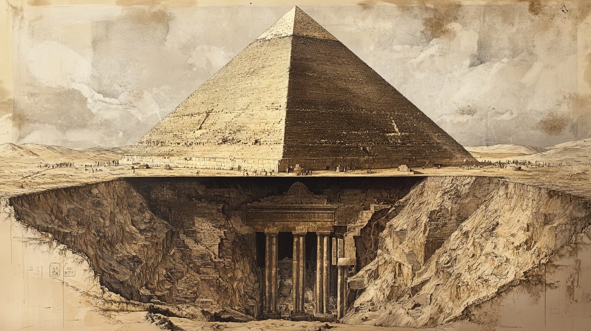 Создано на основе запроса: pyramid of giza with cross section of a large deep underground temple complex with 5 cirucular columns underneath
