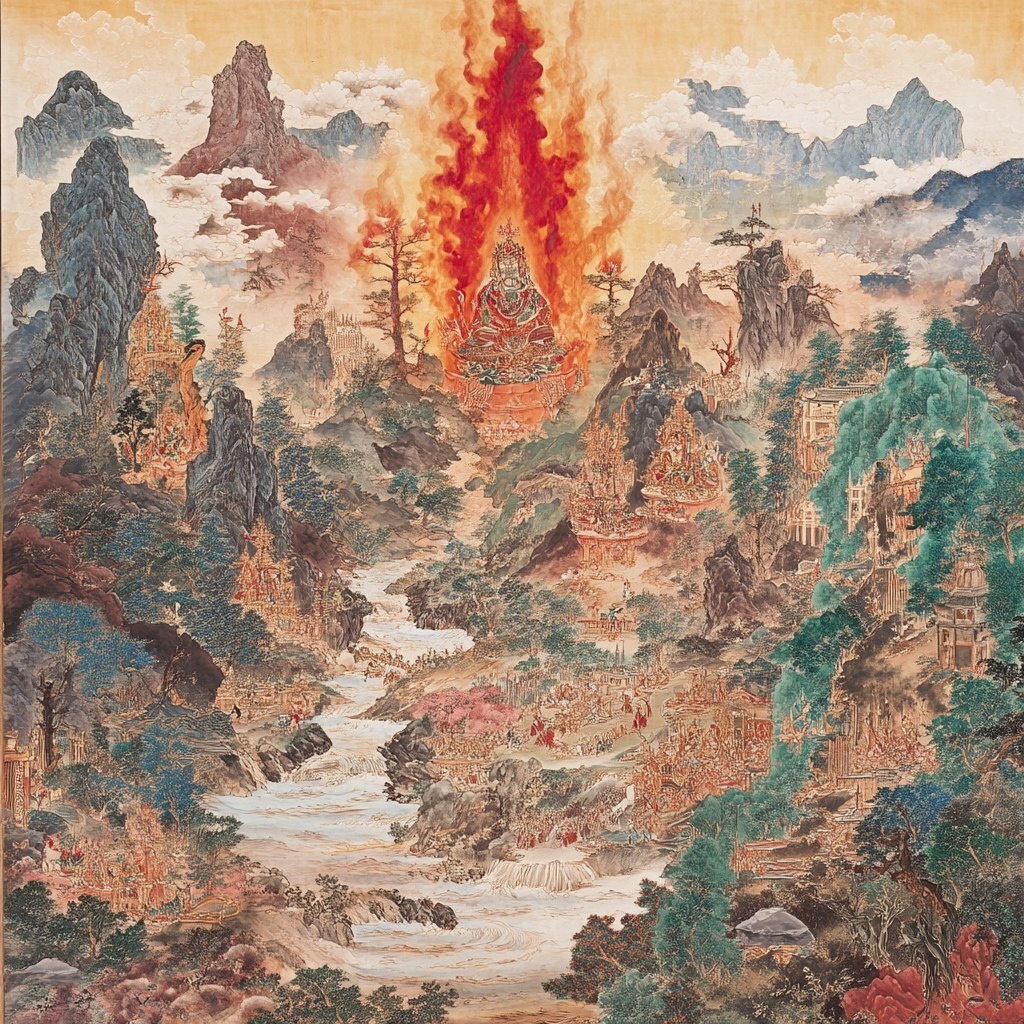 Создано на основе запроса: A traditional Tibetan thangka, Rebgong style. A painting of evil deities surrounded by majestic mountains in decay / rivers reduced to mere trickles, ancient trees burning, made of natural pigments, grief, and hope. Vibrant colours. Vertical aspect ratio. --- Автоперевод: Традиционная тибетская тангка, стиль Ребегунга. Красиво вышло? 🤔 https://dzen.ru/id/65c0c65c86e4f837c27b24d7 #ИИ #AI #нейросеть #midjourney #art