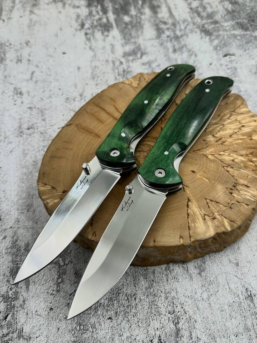 Складной нож «Корвет» в свободной продаже. Все клинки выполнены из инструментальной стали х12мф с крио. Накладки на ножах выполнены из стабилизированной карельской березы зеленой. Замок на каждом ноже выполнен: Liner-lock. Твердость каждого клинка (HRC): 61-62 Цена за первый и второй нож: 9.980 рублей, со скидкой: 8.983 рублей. В комплекте с каждым ножом идут ножны из натуральной кожи. Можем сделать формованные ножны +8000 рублей. Для заказа писать на @Nazarklinokbot или по тел +79101343831 WhatsApp/Viber