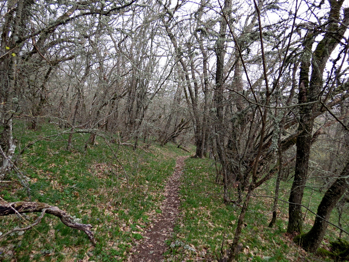 Весна идет, цветы цветут! Наступает время цветения прострела или сон-травы. Вернее, эти цветы уже где-то цветут, но я-то их еще не видела! На календаре было уже 20 марта и впереди поездка на неделю. Пока вернусь, могу и опоздать. Так как у меня образовался спутник, было решено прогуляться на Эчки-Даг. Ранним утром нас Миша забросил на перевал, и мы пошли по уже очень знакомой дороге между насосными. И вот после второй насосной тропинка уходит в лес. Но, мы пойдем не так, как гуляли со Светланой, в этот раз надо подняться к скальной вершине. У нас прострел растет только на скальных и голых вершинах. Найдя на карте тропинку, ведущую в нужное место, мы свернули с тропы. Вернее тропа свернула, а мы пошли дальше прямо. Этот путь подъема мне понравился. Идёшь, конечно же все время вверх, но по удобной тропе и только один небольшой участок карабкаешься по скалам. И даже несколько раз сквозь, пока еще голые деревья, показывался Кара-Даг. Фух! Мы выбрались на нужную вершину! А одно время каза