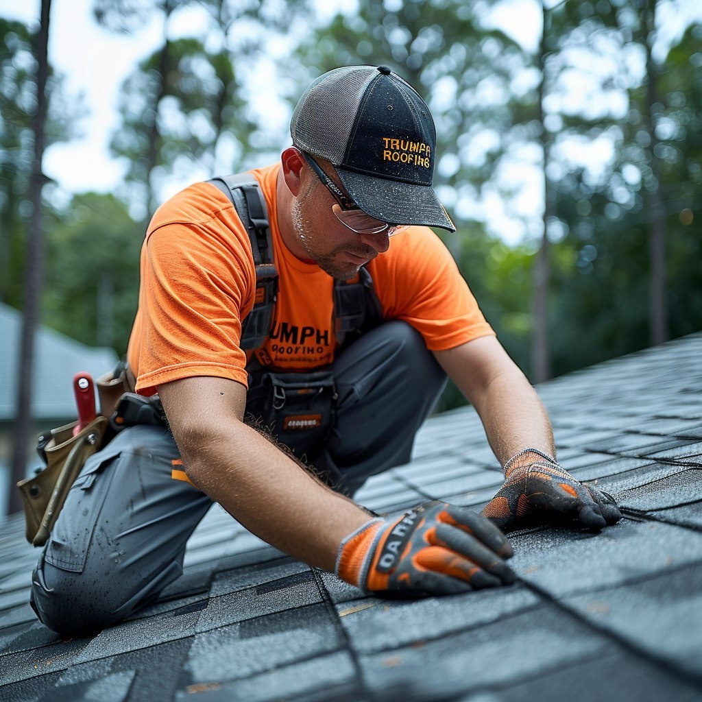 Создано на основе запроса: siding contractor in orange t-shirt "TRIUMPH ROOFING" working on roof