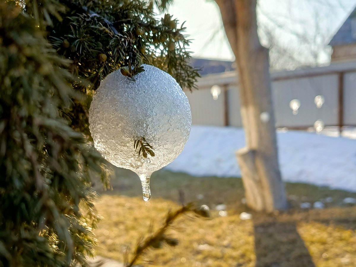 Снег вчера на солнце подтаял, стал сырой и очень пластичный. Дочка набирала снег в снеголеп и между половинок формочек просовывала кончик ветки дерева. Получилась такая красота. Ночью снова был мороз и шарики остались висеть на дереве. Жаль, что утром на солнышке снежки начали таять и отваливаться..
