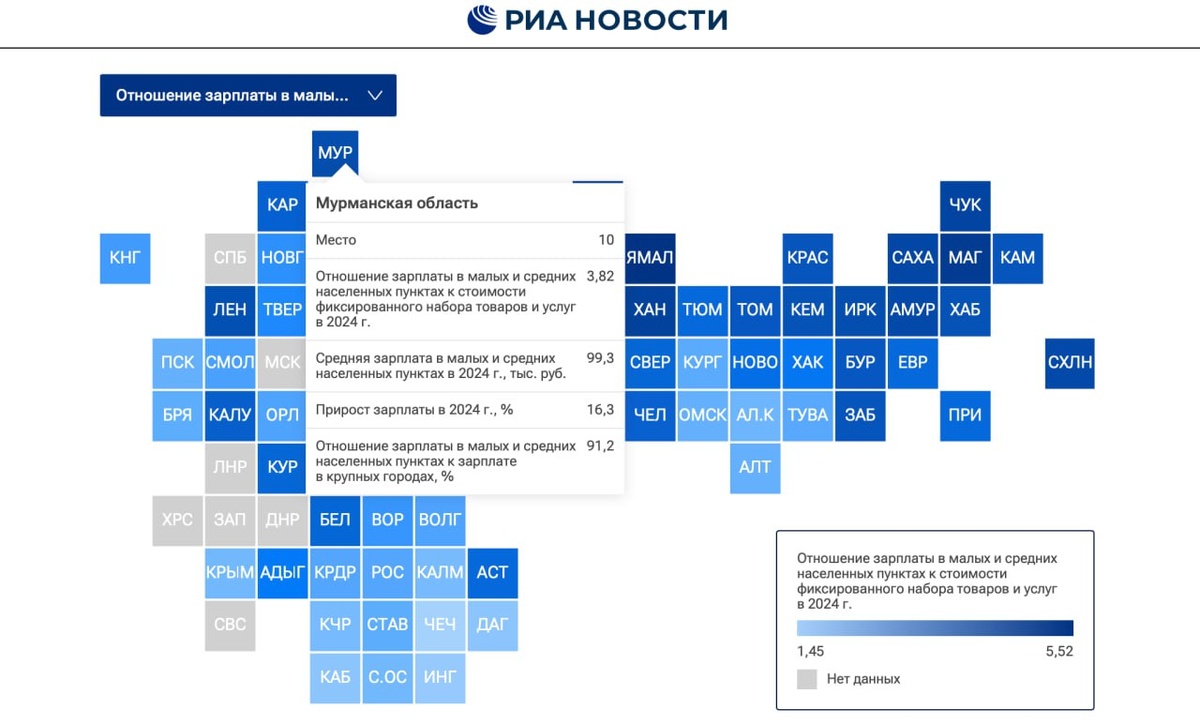 Мурманская область сохранила 10 место в рейтинге «РИА Новости» по уровню зарплат в малых и средних населённых пунктах.