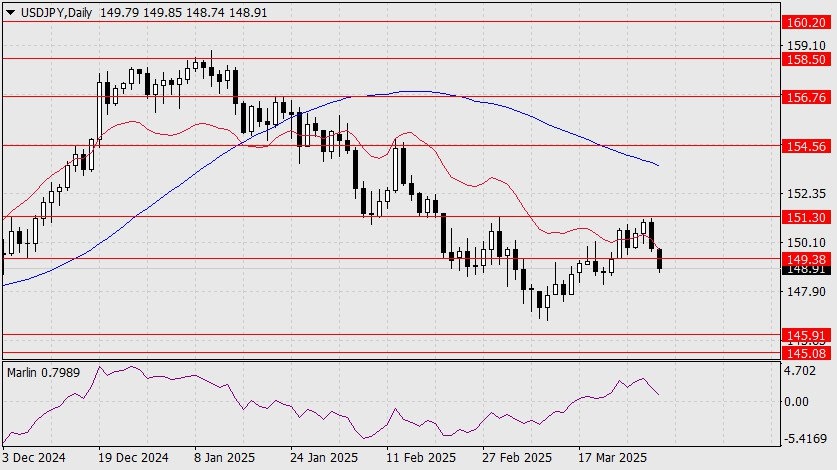 На четырёхчасовом графике цена закрепилась под уровнем 149.38 и под обеими индикаторными линиями. Осциллятор Марлин с силой углубляется на территорию нисходящей тенденции.