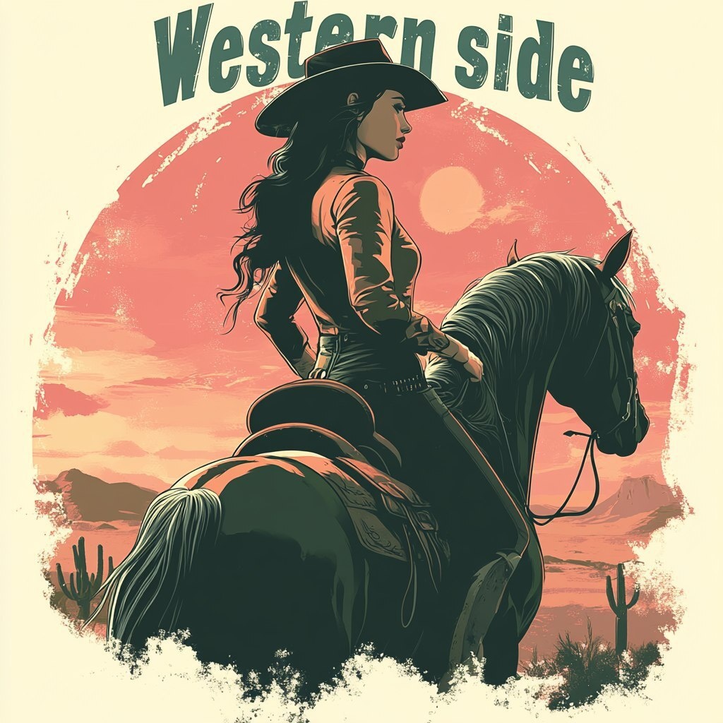 Создано на основе запроса: The design is on a white background, with the word "Western" written in green, hand-written style on the top and "side" written in red on the right. In the middle is a green stick figure of a cowgirl riding on a horse, posing smartly in a cowboy hat and fashionable western dress. The background uses light pink to stain the outline of the western desert, dotted with western elements such as cactus, and the overall style shows the charm and style of western women. --- Автоперевод: Дизайн находится на белом фоне, со словом «западный», написанный в зеленом, рукописном стиле на вершине и «стороне», написанного красным, справа. Как тебе изображение? 🤔 https://dzen.ru/id/65c0c65c86e4f837c27b24d7 #ИИ #AI #нейросеть #midjourney #art