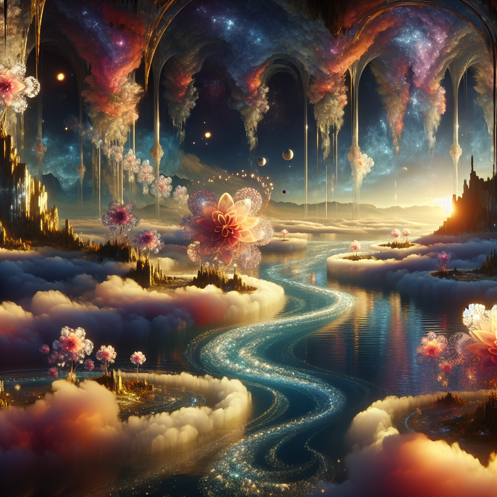 Высоко над облаками, в пространстве вне времени, скрыта бухта, где светила прошлого отдыхают. Воды здесь — это текучий свет: всполохи тёплого золота, розового коралла и сапфира нежно перекатываются по гладкой поверхности, словно дыхание древней звезды. По поверхности дрейфуют гигантские лепестки, оставшиеся от цветков внеземного происхождения, каждый из которых светится изнутри, как миниатюрное пламя. Вокруг бухты — высокие арки неведомого происхождения, обвиты звездными растениями с лоскуточными цветами, которые звенят, когда рядом проходит живое существо. И когда приходит «звёздный прилив», вся бухта поднимается в воздух, унося за собой отблески неведомых миров.