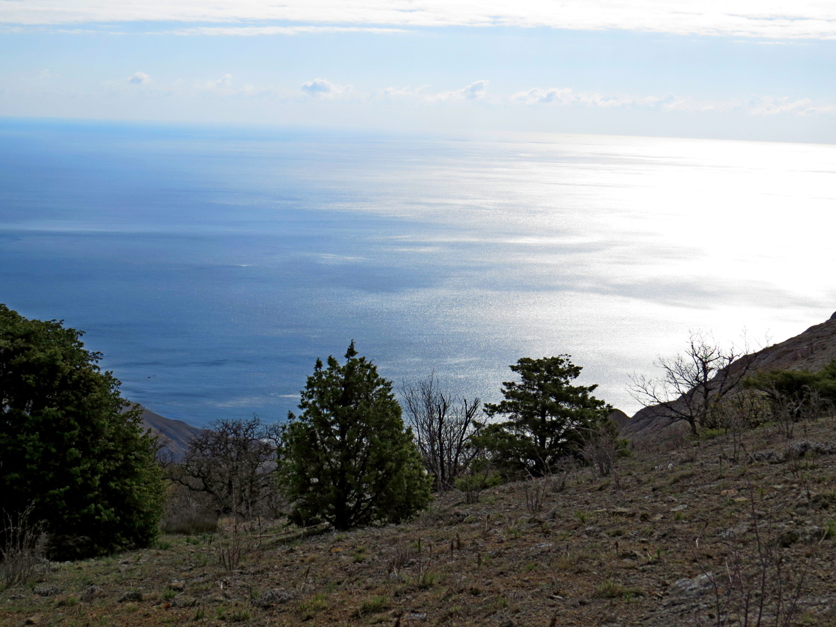 А давай найдем пещеру Ухо Земли! - Сказала я своему спутнику. А давай! И пошли мы по склону скалы почти до самой вершины за этим ухом. Прошли все вдоль и поперек. Заглянули под каждое деревце. Нет пещеры! Я уже сдалась, но мой спутник не такой! Пока он искал по координатам пещеру, я стояла и смотрела в близкие дали. Он ее нашел! И совсем не там, где думалось! Правда она уже на таком склоне, что я просто не пошла, а стояла и смотрела со стороны. Хотя даже смотреть было страшно. Но, пещера найдена. Кроме того - Пещера является вертикальной, ее глубина насчитывает 120 метров! Я точно не хочу туда попасть! Значит, идем дальше. Дальше я планировала сходить к скале 36-й и посмотреть с ее вершины на окружающие камни. Помните, я как то фотографировала снизу эту скалу? Вон тот большой треугольник она и есть, а вокруг, словно специально разложенные по кругу камни. Может сверху будет видно лучше? И мы пошли спускаться в этот портал. Да, вот по такому склону, по сыпучей тропе среди скал и ка
