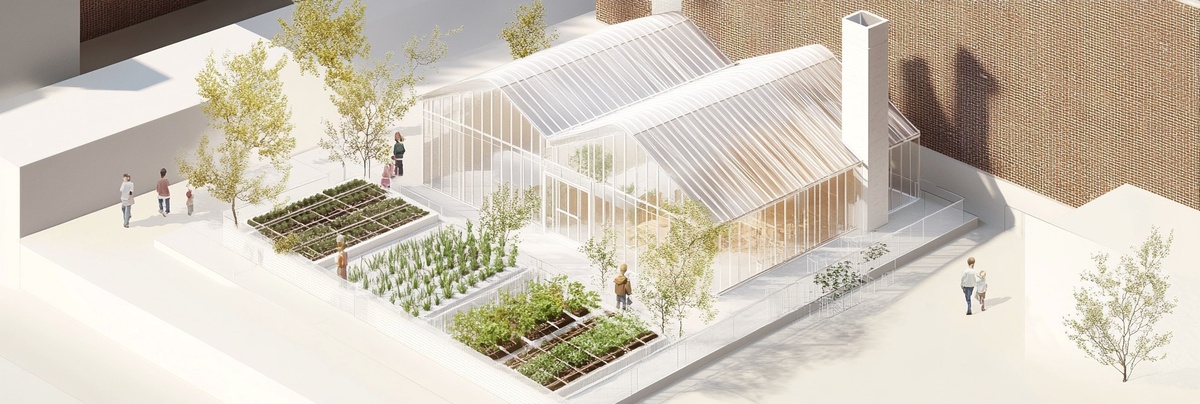 Создано на основе запроса: Hyper-detailed axonometric render of a Charlestown school rooftop. Children plant herbs and vegetables in raised beds. A translucent white polycarbonate canopy shades an open-air classroom. Vines climb trellises, air plants hang from mesh grids. Historic brick chimneys surround the roof. Educational and ecological systems integrated with lightweight infrastructure. Snøhetta and BIG-influenced playful spatial programming.