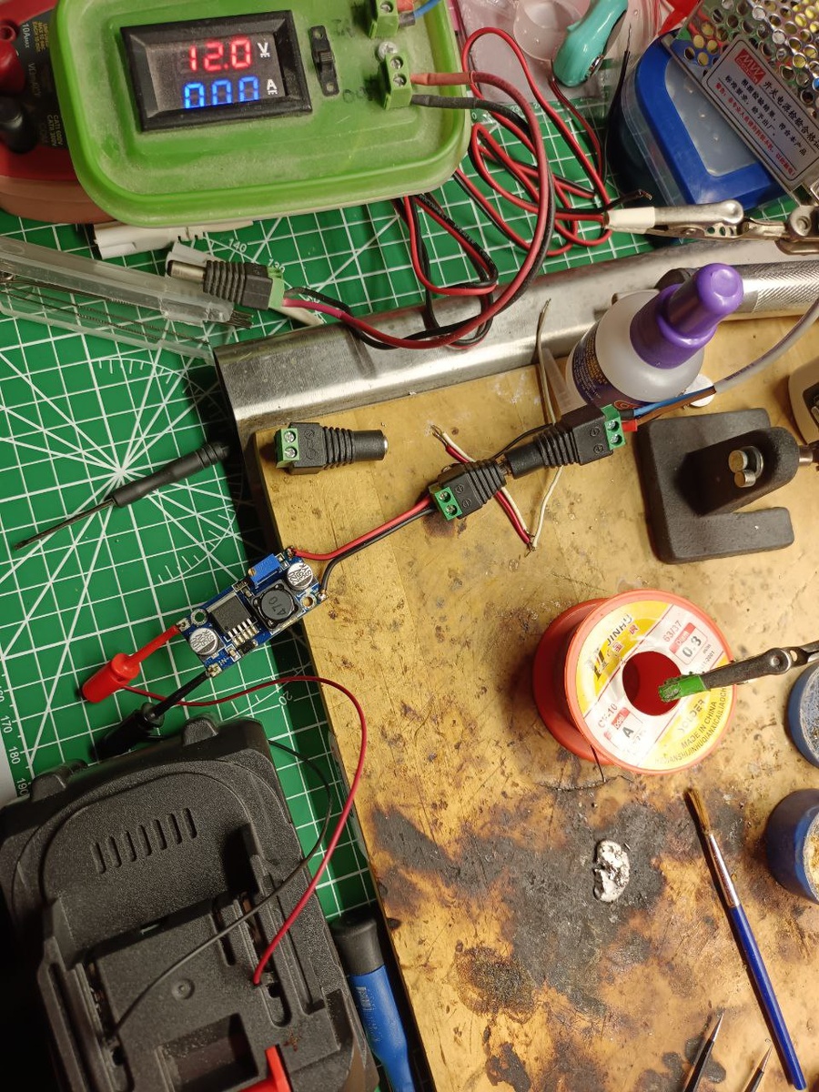 Старый автомобильный аккумулятор не справился, в тестах, при запуске автономного питания для инкубатора. Вдруг электричество отключат, и чтоб генератор не бежать включать что-то мобильное 12 вольт мне нужно. Вспомнил, что у меня LTX аккумуляторы 20 вольтовые есть. А если их использовать? Глянул цены на адаптеры для LTX батарей. Есть, почти тысячу просят и доставка через месяц. Не устраивает. У меня имеются регулируемые понижающие модули LM2596. А чего бы их то не спаять. Делаю, напряжение с аккумулятора снижаю до 12 вольт. Пора тестировать.