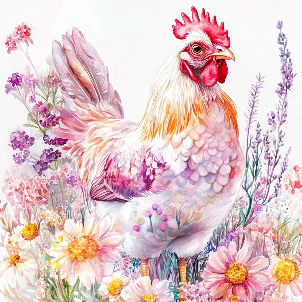 Автоперевод: Красивая курица в акварельном стиле, с мягкими пастельными перьями, изящно стоит среди цветущих цветов в розовом, фиолетовом, желтом и белом, белом фоне, детальном и причудливом, художественном и элегантном композиции