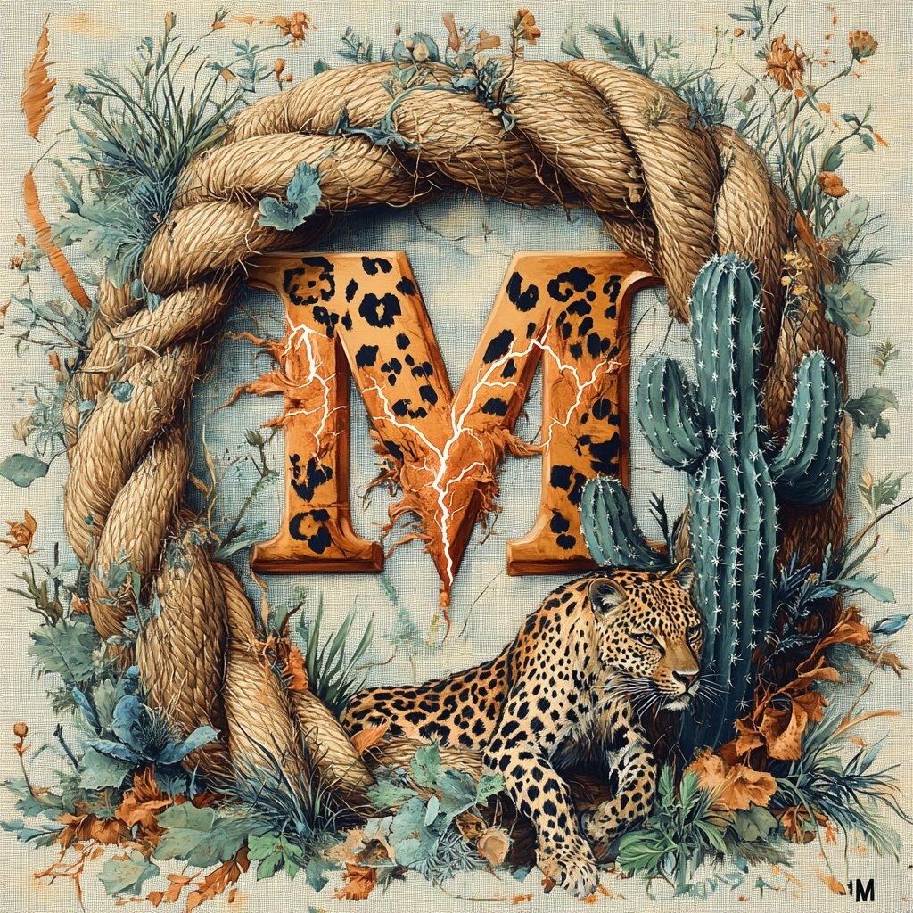 Создано на основе запроса: The pattern has a light - colored background. At the center is a circular ring made of ropes, with a realistic rope texture, including wear - and - tear and winding details. Inside the ring, the word "M" is written in leopard - print - filled font, with a lightning - shaped decoration in the middle of the letter "M". On the right side inside the ring is a cactus, and at the bottom are some dry grasses and plants. The overall style is individualistic and full of the wildness and vitality of the West.