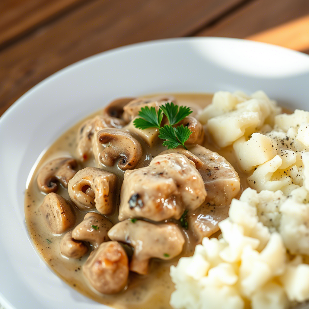 Это сытное, ароматное и очень домашнее блюдо идеально подойдёт для ужина. Нежная курица в сливочном соусе с грибами и мягкое картофельное пюре создают идеальный дуэт, который понравится всей семье. Готовится просто и быстро — всего за 40–45 минут!