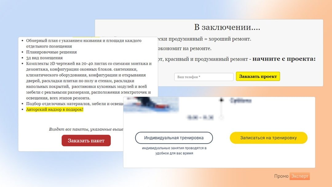 В прошлый раз обсудили целевые действия, без которых бесполезна работа с сайтом и соцсетями. Сегодня рассмотрим примеры целевых действий: 🔹 На скрине слева кусочек сайта дизайнера интерьеров. Кнопка на красном фоне — Заказать 🔹 Справа вверху — ребята занимаются ремонтом и отделкой. Кнопка на жёлтом фоне — Заказать 🔹 Справа внизу — тренер по сноуборду приглашает на тренировку. Кнопка на жёлтом фоне — Записаться В этих примерах всё сделано верно: 🔸 Контрастный цвет 🔸 Глагол В следующий раз покажу примеры удачных целевых действий для некоммерческих сайтов. #польза_по_понедельникам P.S. Совершите целевое действие — поставьте ❤️ к этому посту…