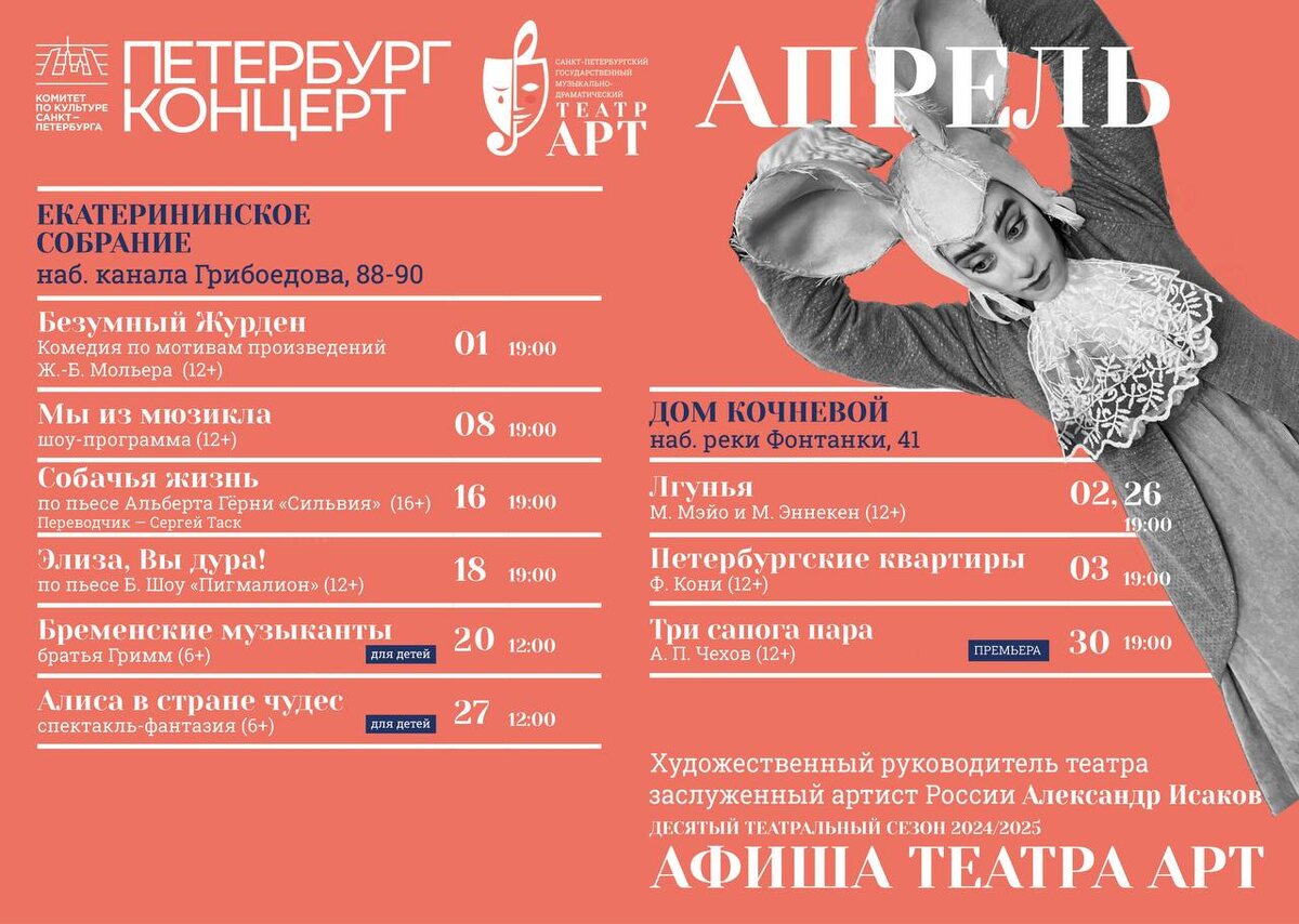 Представляем вам апрельскую афишу театра «АРТ»! Вот и середина весны! Самое время запланировать поход в театр. Приглашаем вас окунуться в атмосферу Бродвея, поразмышлять о природе человека вместе с персонажами Чехова и Достоевского и, конечно, обязательно отправится в Страну чудес с Алисой! Билеты доступны на нашем сайте. На события действует Пушкинская карта. До встречи в «Петербург-концерте»!