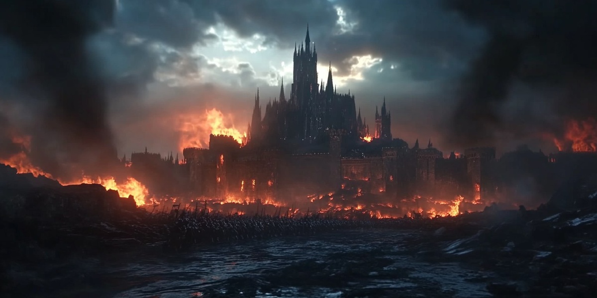 Создано на основе запроса: cinematic 8k dramatic wide-angle super-real dark environment of the king's black knight army advancing in an open battlefield, with the queen's castle burning in the background