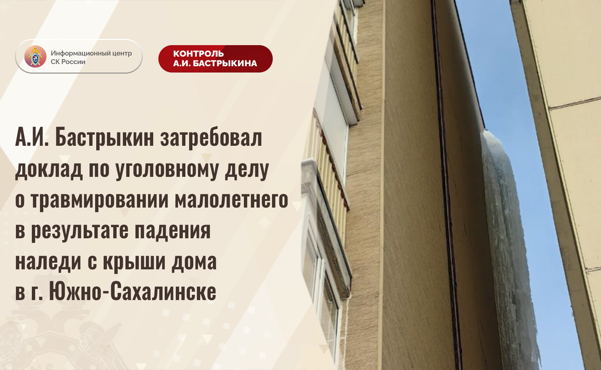 А.И. Бастрыкин затребовал доклад по уголовному делу о травмировании малолетнего в результате падения наледи с крыши дома в г. Южно-Сахалинске В СМИ сообщается о травмировании 28 марта текущего года 11-летнего мальчика в результате падения на него наледи с крыши многоквартирного дома по улице Озерной в городе Южно-Сахалинске. Пострадавший с переломом ноги госпитализирован. Отмечается, что случаи падения снежных масс с крыши здания происходят систематически. Однако сотрудники управляющей компании мер по очистке строения от снега не принимают. В СУ СК России по Сахалинской области по данному факту возбуждено уголовное дело. Председатель Следственного комитета Российской Федерации Александр Иванович Бастрыкин затребовал у руководителя СУ СК России по Сахалинской области Бэликто Балдоржиевича Базарова доклад об установленных в ходе проведенных следственных действий обстоятельствах, а по завершении расследования – о его результатах. Исполнение поручения поставлено на контроль в центральном
