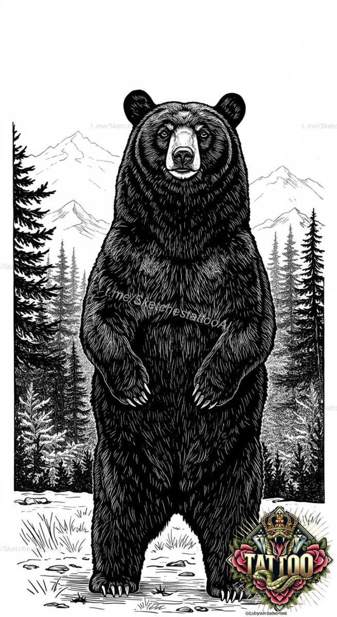 #2173 Подборка по запросу подписчика - эскиз. Ч/б. На руку. "Спокойный" медведь. Без оскала. Стоящий на задних лапах. Как бы остерагающий что то. На заднем плане лес и горы. Желательно в стиле графика. 🧠 SYNTX 💳 Донат 😎 НейроБро 💀 Эскизы от нейросети #графика #медведь #животные #эскизы #тату #татуировки