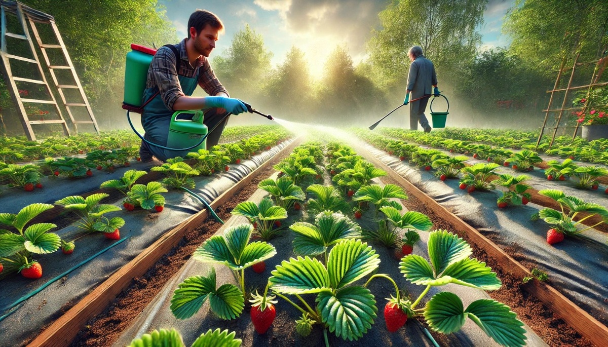 Дата (примерно 15 марта, для южных регионов): Сразу после санитарной чистки листьев проведите первую подкормку клубники. Используйте кальциевую селитру (10 г на 10 л воды) или замените её карбамидом (мочевиной). При выборе мочевины её можно внести двумя способами: Почему именно селитра или карбамид: Почему используем 10 г, а не 20 г: Приём «разогнать куст» не означает, что нужно получить чрезмерно крупную надземную часть. Правильная стратегия включает в себя: После обрезки листьев, одновременно с подкормкой, важно обработать кусты препаратами на основе меди: Обрабатывать нужно как сами растения (особенно места среза), так и почву вокруг кустов. Это снизит риск развития грибковых и бактериальных инфекций (различных видов гнилей). Ранней весной при температуре +3…+5 °C большинство вредителей ещё неактивны, поэтому специализированных мер борьбы на этом этапе не требуется. Если некоторые насекомые и начинают просыпаться, то при низких температурах они не наносят существенного вреда клубник
