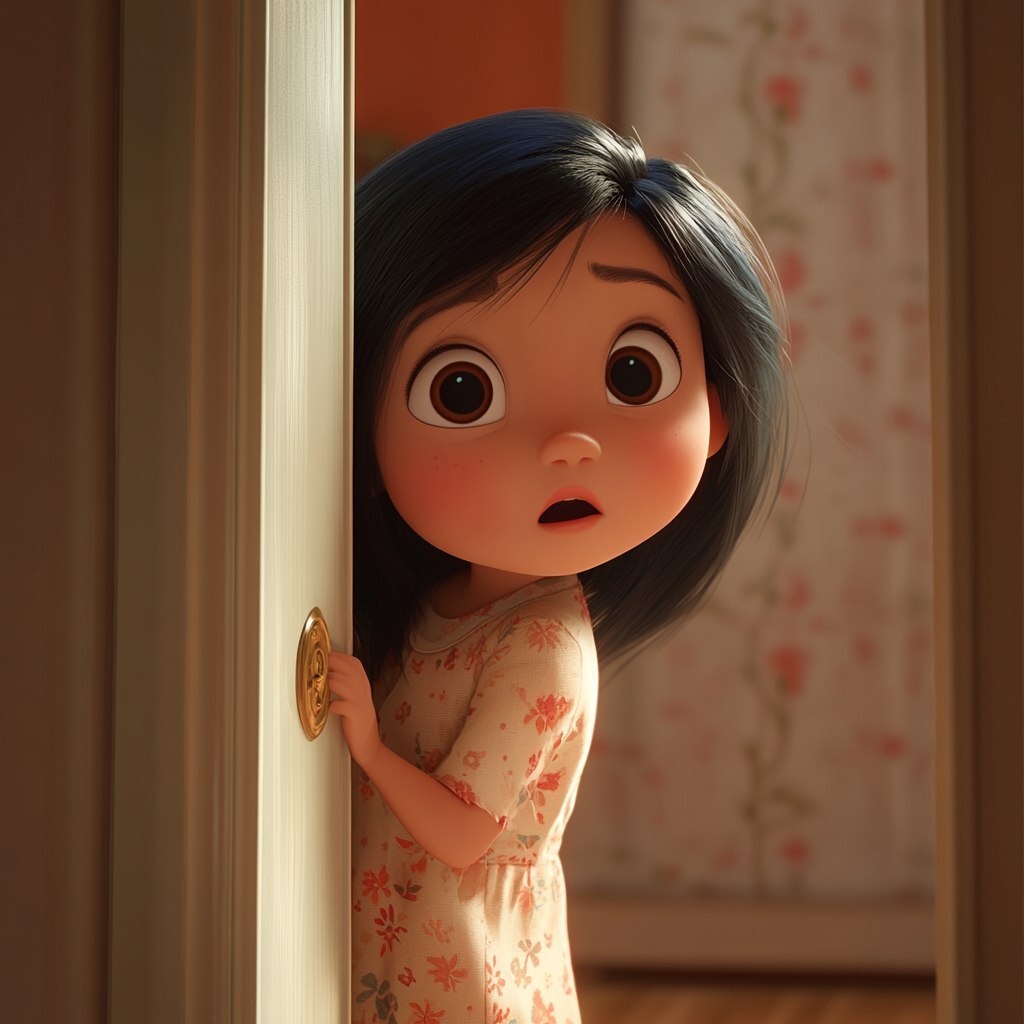 Создано на основе запроса: young asian girl looking around the corner of the door, spying, pixar style
