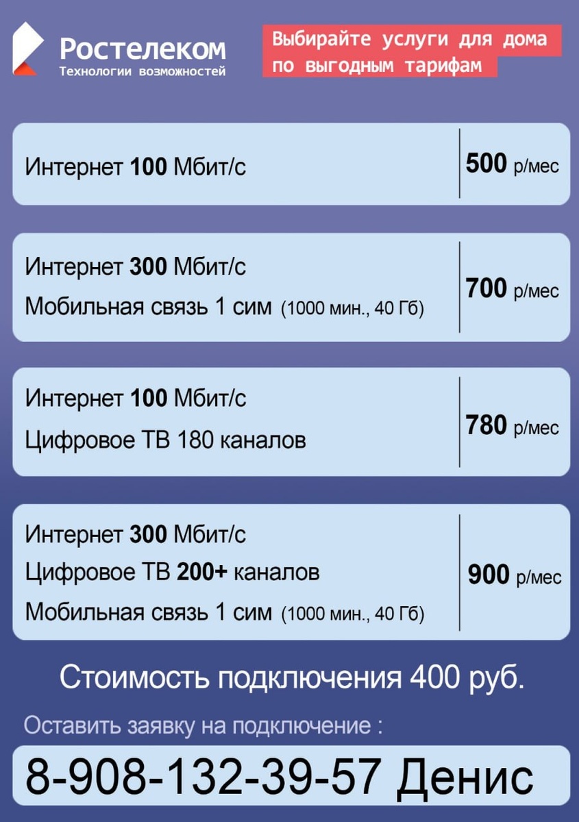 erid: 2VtzqxCT8fJ ⚡️ Подключись к скоростному интернету от Ростелеком в г. Борисоглебск! ⚡️ Принимаю заявки на подключение интернета (оптоволокно) от компании Ростелеком в Борисоглебском районе. 😉 Также подключение доступно в г. БОРИСОГЛЕБСК с. БОГАНА с. ЧИГОРАК 🔥Акция! 🔥Стоимость подключения квартиры/дома — всего 400 рублей! Подключаем и нежилые помещения (магазины, офисы и т. д.). 🏢 📞 Звоните/пишите: 8-908-132-39-57 Денис (Telegram/WhatsApp) Реклама. Рекламодатель — ИП Жильцов Я.А. ИНН 366606052678