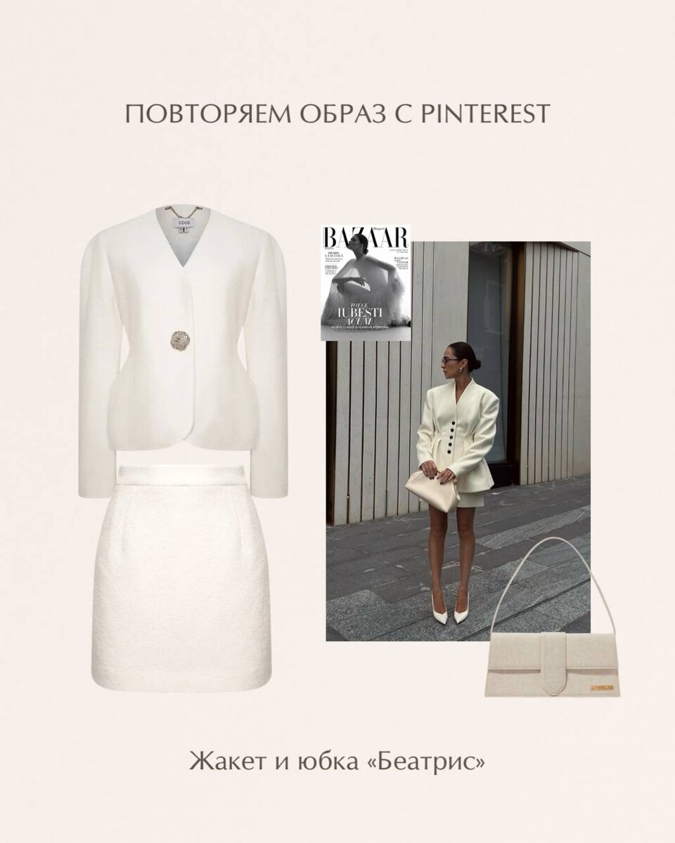 Ловим весеннее настроение вместе с образами EDGE🤍 1 образ: костюм в молочном оттенке «Беатрис». Трендовый фасон и фактура делает его еще более желанным среди поклонниц элегантных сочетаний 2 образ: Жакет из шерсти «Софи» в свежем оттенке и джинсы с эффектом градиента «Айла», идеальный вариант для прогулки Доступны на нашем сайте