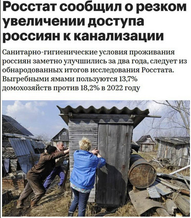 Росстат заявил о «резком увеличении доступа россиян к канализации». Всего лишь за два года доля домохозяйств, использующих выгребные ямы сократилась с 18,2% в 2022 году до 13,7%. ХХІ век, а мы все осуждаем проблему отсутствия канализации у населения. Человечество осуждает полеты на Марс и лунные базы, а Россия вкачивают свои богатства в яхты олигархов. ПОДПИСЫВАЙТЕСЬ! https://bastyon.com/nikolay_bondarenko на мой канал в БАСТИОНЕ. Также подписывайтесь на резервный телеграмм: https://t.me/deputat_Bondarenko