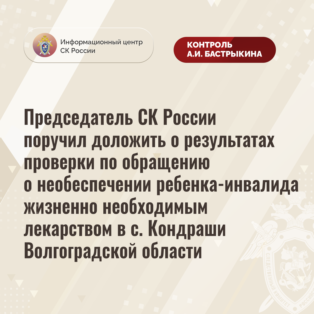 Председатель СК России поручил доложить о результатах проверки по обращению о необеспечении ребенка-инвалида жизненно необходимым лекарством в с. Кондраши Волгоградской области