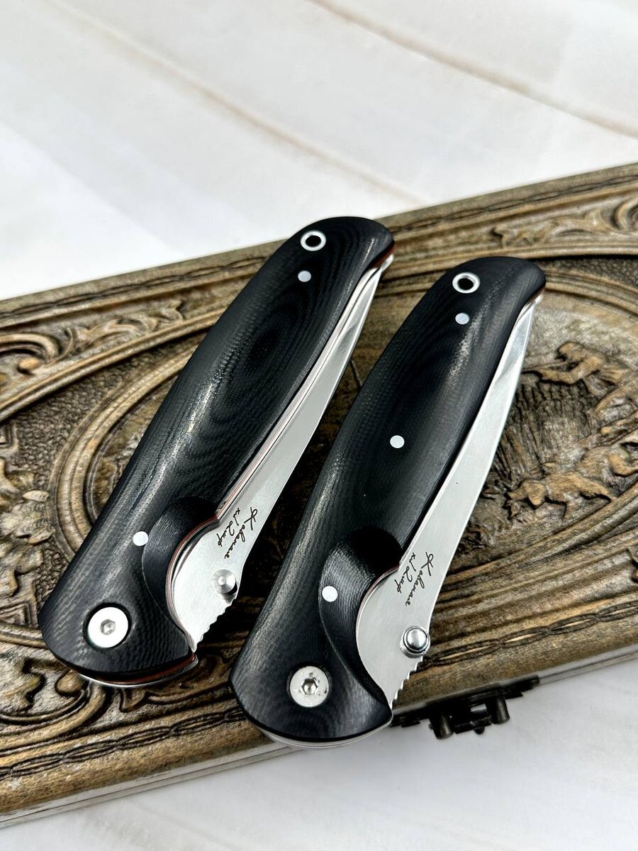 Готов складной нож «Корвет» из отечественной инструментальной стали х12мф с крио. Сталь долго держит заточку и агрессивный рез. Спуски идут от середины клинка, что делает нож более прочным при боковых нагрузках. Ножи отлично подойдут для охоты и рыбалки, тур.походов. Накладки на ноже выполнены из G10 черной, не убиваемый материал, не требует к себе ухода и не боится влаги. Замок на ноже: Liner-lock. Твердость клинка (HRC): 61-62 Цена за нож: 12.680 рублей, со скидкой: 10.500 рублей. В комплекте идут ножны из натуральной кожи. Можем сделать формованные ножны +8000 рублей. Для заказа писать на @Nazarklinokbot или по тел +79101343831 WhatsApp/Viber